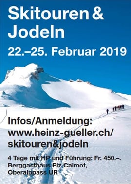 Die bereits 13te Ausgabe von Skitouren & Jodeln führt uns ins Urnerland und zwar auf den Oberalppass ins Berggasthaus Piz Calmot. Der Oberalppass liegt auf 2‘044 m.ü.M. und ist mit den öffentlichen Verkehrsmitteln und mit PW bis Andermatt resp. Disentis gut erreichbar. Dank der Unterkunft auf über 2‘000 Meter ist diese Region sehr Schneesicher. Direkt von der Unterkunft können attraktive Skitouren in jedem Schwierigkeitsgrad und entsprechend den aktuellen Verhältnissen mit Abfahrten bis nach Andermatt oder Disentis (> 1400 Hm) unternommen werden.