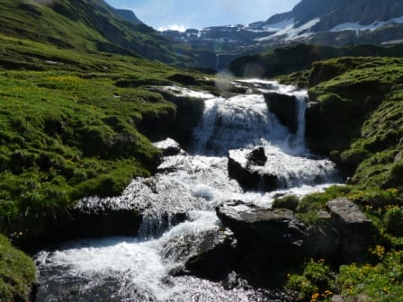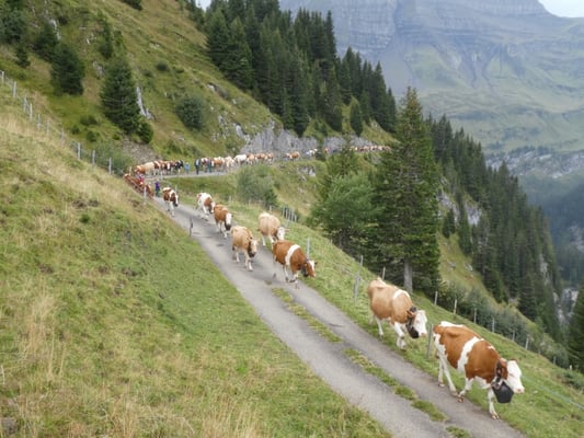 Vor der Alpauffahrt wurde früh Morgens um drei Uhr den Kühen Glocken und Treicheln umgehängt. Um ca. vier Uhr starteten wir von der Schweibenalp Richtung Alp Tschingelfeld. Auf dem Weg Richtung Axalp stiessen immer mehr Kühe, Rinder und Kälber dazu. Von den insgesamt 130 Stück Vieh waren 70 Kühe. Nach ca. vier Stunden erreichten die Weri. Weri ist der 1. Stafel der Alp Tschingelfeld. Im Verlaufe des Sommers wird zum Oberberg (2. Stafel) und Kühberg (3. Stafel) gewechselt.