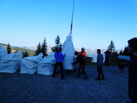 Die Verschiebung des "Chästeilet" um eine Woche auf den 23. Sept. 2017 hatte sich gelohnt. Bei herrlichem Wetter konnte der rund 4'700 kg produzierte Alpkäse geteilt werden. Am Morgen um 7 Uhr wurde der Käse im Oberbärg direkt aus dem Spycher in fünf Säcke à ca. 950 kg abgefüllt und anschliessend mit dem Helikopter auf die Teltisegg geflogen. Im Rückflug wurde bereits für den nächsten Alpsommer Brennholz transportiert. Der Käse wurde anschliessend mit den Nummern nach vorne auf Tische verteilt und ab 11 Uhr konnte mit dem Teilet begonnen werden.