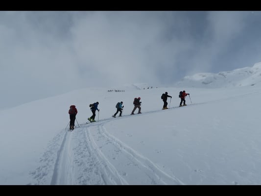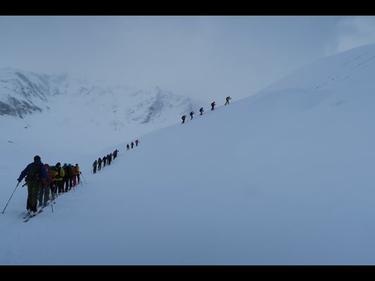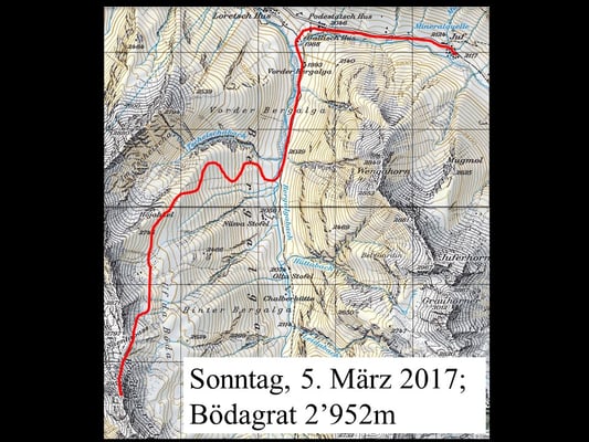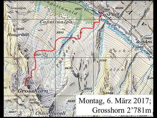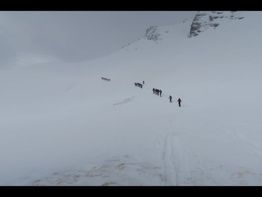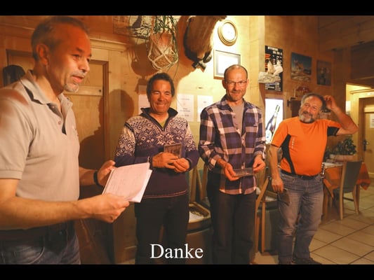 Das Wetter spielte nicht immer mit, doch überwiegte die Freude an der Natur, am Jodelgesang, am Musizieren und an der Kameradschaft. Trotz den teilweise stürmischen und äusserst schwierigen Verhältnissen (Lawinengefahr erheblich) und einer defensiven Routenwahl verstand es Hampi Schoop attraktive Tourenziele anzubieten. So wurden die Gipfel „Uf da Flüe 2‘700m, Juferhorn 2‘967m (Umkehr 2‘620m), Bödegrat 2‘920m und das Grosshorn 2‘820m bestiegen.