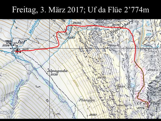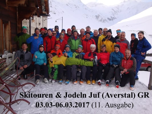 Vom 3. bis 6. März 2017 trafen sich 33 sportliche und gesangsfreudige Teilnehmer und Teilnehmerinnen im höchstgelegenen Dorf Europas in Juf GR auf 2‘126 M.ü.M. zur 11ten Ausgabe des äusserst beliebten Kurses Skitouren & Jodeln. Aus Platzgründen fand der diesjährige Kurs erstmals ohne Schneeschuhläufer und --Läuferinnen statt. Die Gesamtleitung hatte der Jodler, Dirigenten und Komponist Heinz Güller. Die Skitouren fanden unter der Leitung von Hampi Schoop (Bergführer), Fritz Halter (Mitgl. Rettungskolonne), Fritz Ammann und Heinz Güller (beide Tourenleiter SAC) statt.